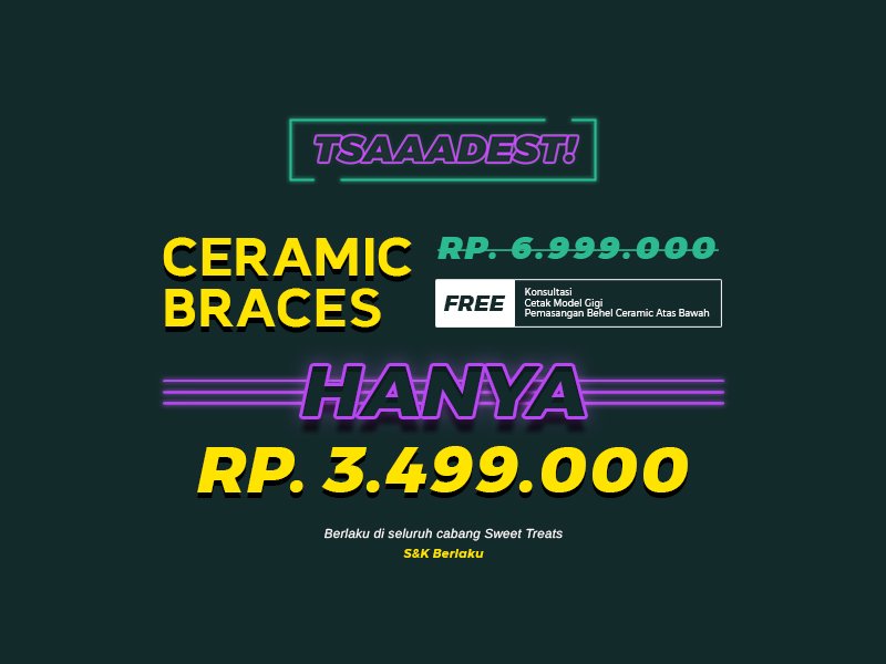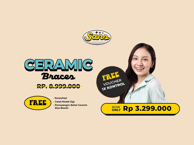 Terkadang banyak orang yang tidak percaya diri karena bentuk gigi mereka yang berantakan dan tidak tersusun rapih atau bahkan berwarna kuning yang cenderung dapat menurunkan tingkat kepercayaan diri dalam berpenampilan. Bukan cuma itu, akibat bentuk gigi yang tidak sejajar juga menyulitkan kalian ketika mengkonsumsi makanan dan menyebabkan tidak hancur secara maksimal, selain itu juga dapat mengganggu kesehatan pada gigi dan mulut. Menurut survey Sweet Crew, alasan mereka yang memiliki gigi tidak rapih dan menunda untuk tidak memakai behel adalah karena masalah biaya yang cukup mahal, progress pemasangan yang membutuhkan waktu lama, dan belum ada waktu untuk konsultasi ke klinik gigi. Padahal kalo kamu perawatan di Sweet Treats bakal nemuin banyak promo yang harganya lebih terjangkau dan bisa bantu kamu untuk mengatasi permasalahan gigi tanpa perlu worry kemahalan. Pas banget dibulan Oktober ini Sweet Treats lagi ngadain promo behel Ceramic dengan harga Rp 3.299.000 cocok buat kamu yang mau pake behel dengan bentuk simple karena jenis behel ini transparant jadi bikin kamu makin pede.