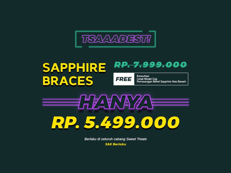 Dengan banyak kelebihan terutama dari segi penampilan, Sweet Tooth's tidak perlu merogoh kocek dalam-dalam, karena bulan ini Sweet Treats punya penawaran menarik untuk kamu yang ingin tratment Sapphore Braces dengan harga Rp 5,499,000 sudah termasuk FREE KONSULTASI, CETAK MODEL GIGI, dan PEMASANGAN BEHEL SAPPHIRE ATAS BAWAH. Langsung aja reservasi melalui LINE, Whatsapp, atau DM Instagram Sweet Treats ya!