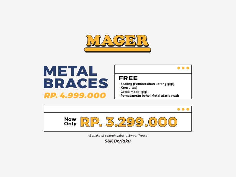 MAGER rapihini gigi yang berantakan? Sweet Treats punya promo biar kamu ga MAGERE terus-terusan nih! MAGER Metal Braces hanya 3-jtan sudah bisa wujudkan impian gigi rapih dengan behel meta. Sudah termasuk FREE KONSULTASI, FREE GENERAL CHECK UP, CETAK MODEL GIGI, dan PEMASANGAN BEHEL ATAS BAWAH. Kuy reservasi langsung bisa di DM di Instagram, LINE, atau Whatsapp ya! Syarat & Ketentuan Berlaku