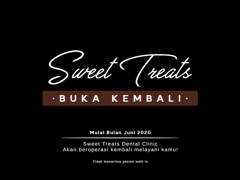 Kabar baik untuk Sweet Tooth's yang sudah lama tidak melakukan perawaran di Sweet Treats. Di bulan Juni 2020 Sweet Treats siap beroperasi kembali dengan penyesuaian protocol pencegahan wabah Covid-19 dengan beberapa ketentuan. Di antaranya, pengunjung wajib mengikuti aturan yang berlaku sesuai dengan skema physical distancing yang dilakukan pemerintah dengan tidak menerima pasien walk-in, selain itu Sweet Treats juga menyiapkan beberapa penanggulangan secara khusus dan berkala untuk seluruh ruangan yang berada di seluruh cabang Sweet Treats Dental Clinic dengan melakukan sterilisasi tiap pasien menyelesaikan treatment di Sweet Treats. Selain itu Dokter dan Perawat juga wajib menggunakan Alat Pelindung Diri lengkap dengan baju hazmat hingga face shield demi keamanan bersama. Mungkin ini akan jadi hal baru buat kita semua, tapi kami siap berusaha memberikan pelayanan yang terbaik untuk semua Sweet Tooth's.